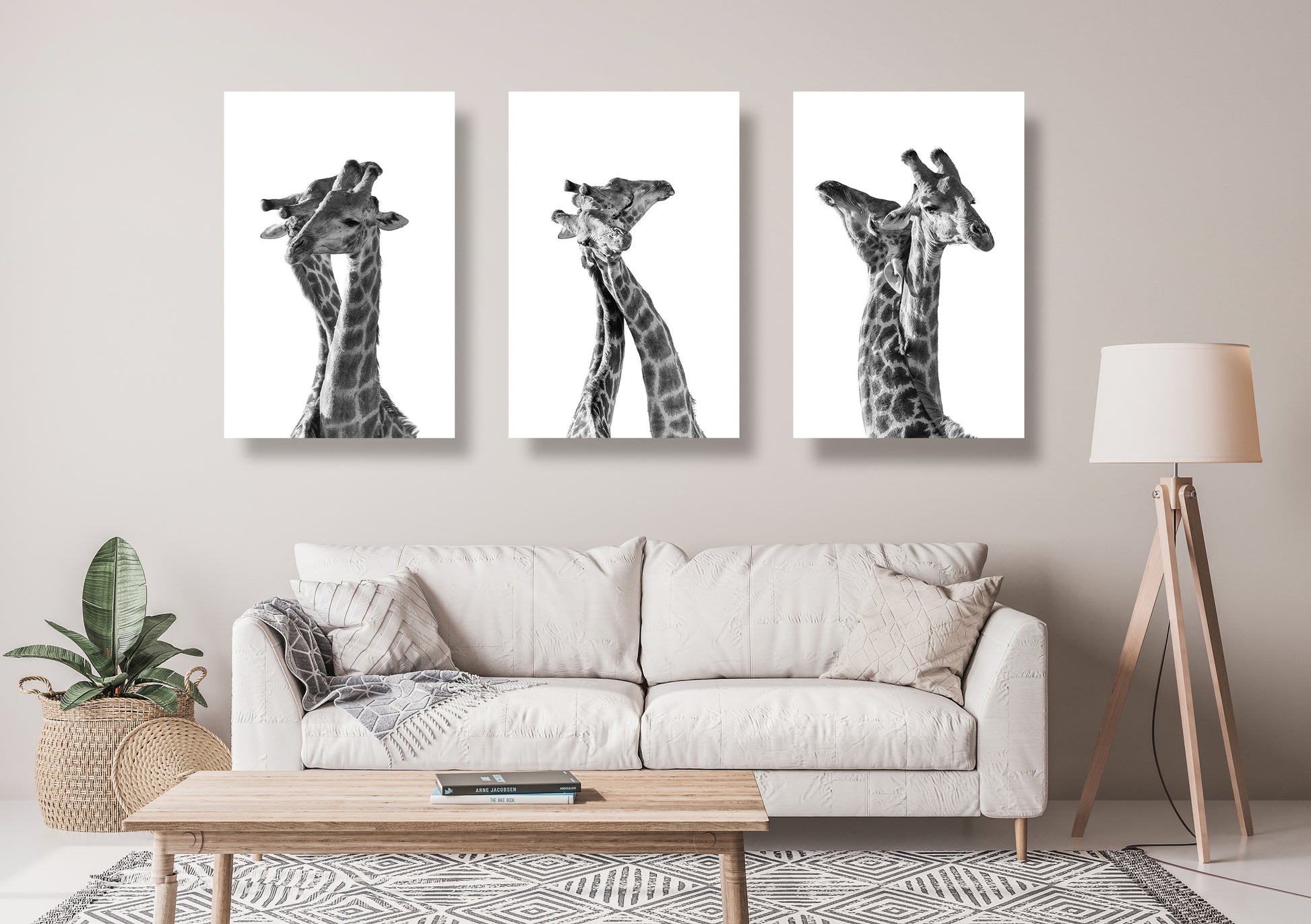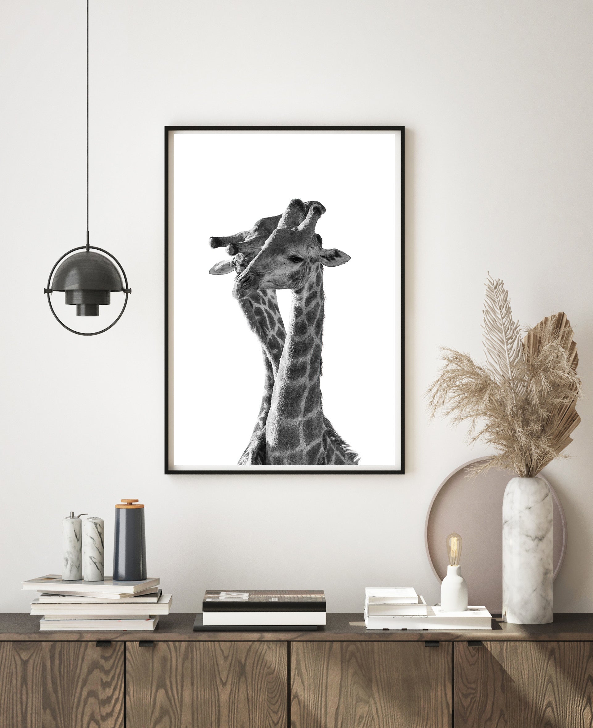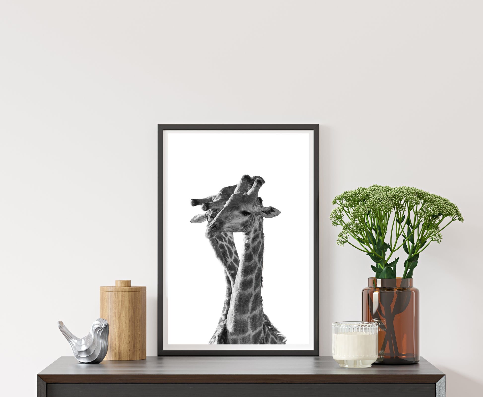 Two giraffes share a moment of intimacy, their long necks entwined in a gentle embrace. The black and white photograph captures the grace and beauty of these magnificent creatures, creating a simple yet stunning image that conveys a message of love and connection.